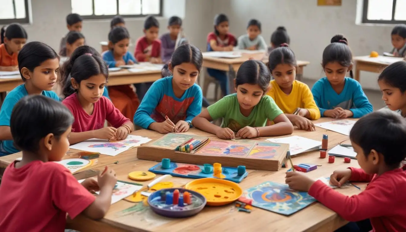 Children explore various musical instruments, enhancing their tactile and auditory skills.